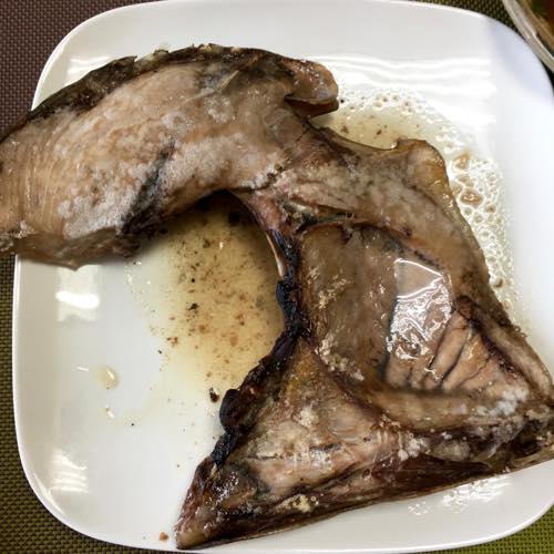 昨日がお肉だったので、今日は魚にしようと魚売り場を見て回っていたらキワダマグロ(キハダマグロ)の大きなカマが500円とお得価格でした。
