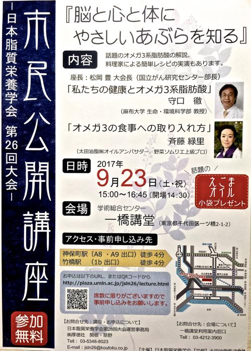 「脳と心と体にやさしいあぶらを知る」をテーマに開催される無料の公開講座もいよいよ来週末になりました。