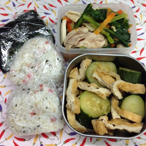 お昼は鮭のおにぎりと鶏、野菜のお弁当でした。