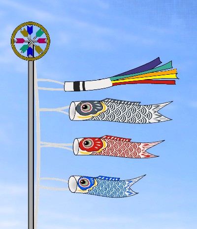 子どもの健康な成長を願う鯉のぼり。一番上には鯉とは違う形の吹き流しが飾られています。