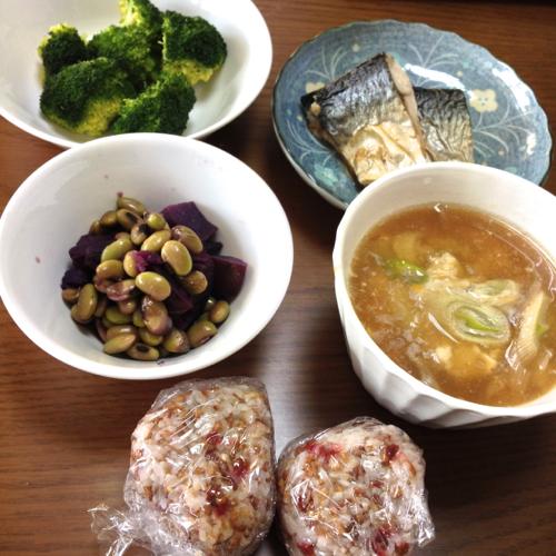 まだ休みの主人のブランチはサバ、野菜、梅とローストアマニ粒のおにぎりでした。