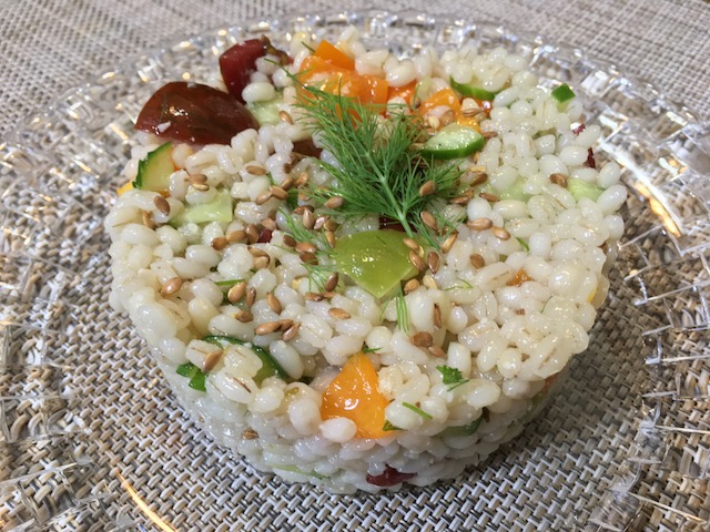 もち麦・トマト・キュウリ・ディル・ローストアマニ粒