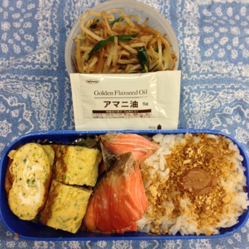 お昼は鮭、玉子焼き、野菜、亜麻仁パウダー、亜麻仁油のお弁当でした。