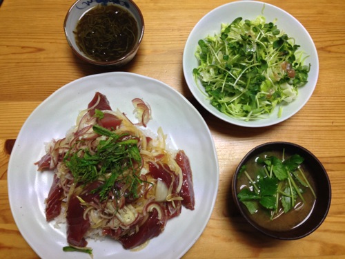 さて、夕飯はアマランサスで鰹のまぜ寿司とあさりのお味噌汁です。