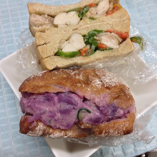 昨日のお昼は 紫芋のポテサラとチキンのサンドイッチでした。