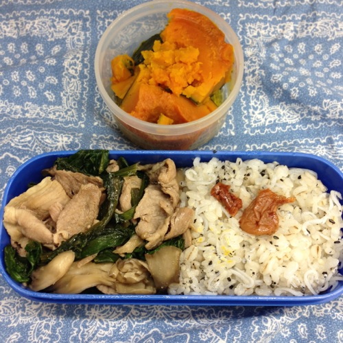 お昼は肉野菜炒めとかぼちゃのお弁当でした。