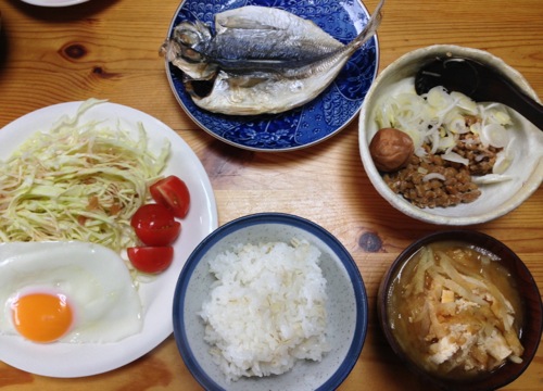 他には鯵の干物、納豆、自家製梅干し、具沢山味噌汁でした。