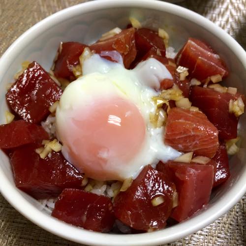 天然本マグロ:自家製出汁醤油・みりん・新玉ねぎ・温玉