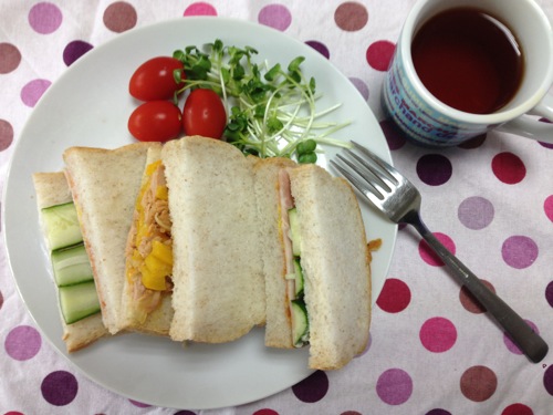 休日だった主人のブランチはハムキュウリとツナパプリカのサンドイッチでした。