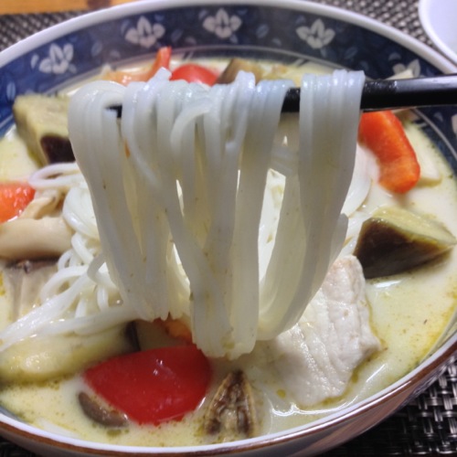 冷えて乾燥した晴天はすっかり初冬の気配。温まるピリ辛のグリーンカレー麺(米麺)とめかぶキュウリの休肝日です。