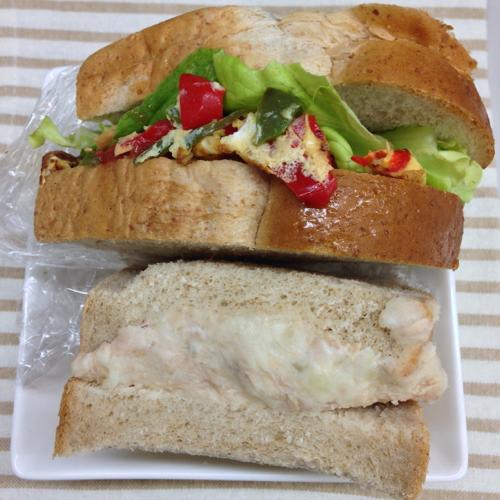 セロリ、ブロッコリー、明太子パスタ&エゴマツナサンド