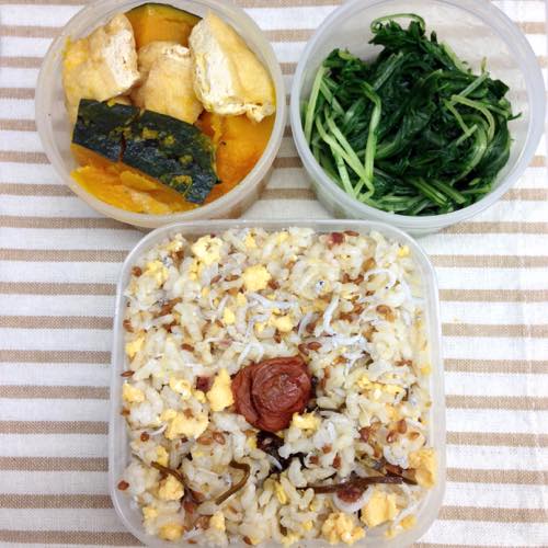 お昼はしらす、たまご、昆布、アマニ粒の炊き込み御飯と野菜のお弁当でした。