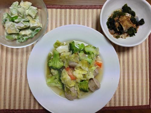 明日から5月です。その前日の夕飯はソーセージと春キャベツのスープです。