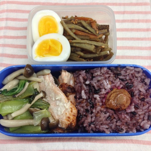 お昼は、鮭・キンピラ・玉子・シメジと野菜のお弁当でした。
