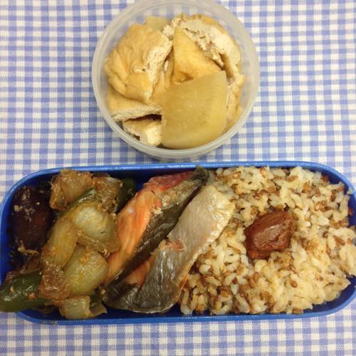お昼は、鮭、野菜、発芽玄米のお弁当でした。