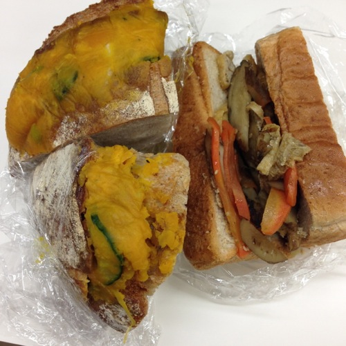 主人のお弁当はかぼちゃサラダとキンピラのサンドイッチでした。