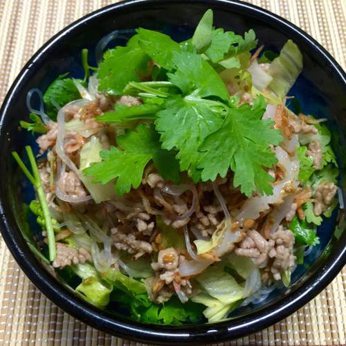 緑豆春雨・豚ひき肉・アミエビ・イカ・レタス・パクチー・ローストアマニ粒