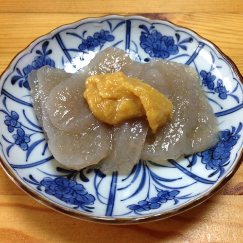 カブの千枚漬けとFさんからいただいた手作りコンニャクに酢味噌を和えて、お粥といっしょにいただきます。