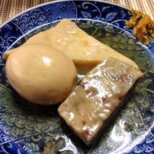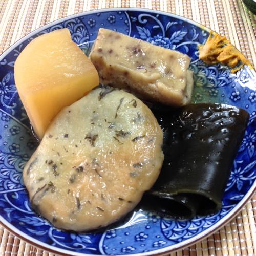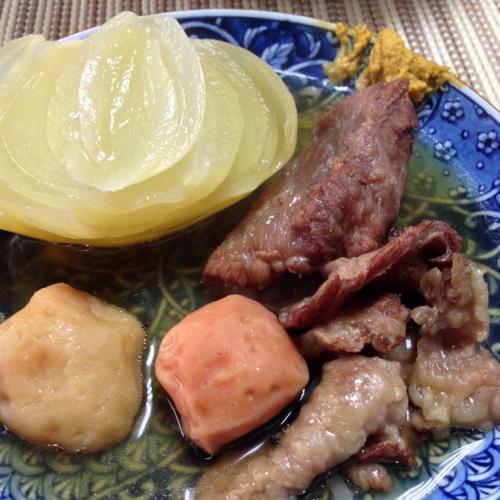 時期を考えてみれば当たり前なのですが、こめ油で揚げた鈴廣の安心練り物は無く、近くの「こだわりや」さんでつみれやこんにゃく、お麩などを購入。そこに大根、玉ねぎ、昆布、玉子など、それに牛すじを入れたおでんになりました。