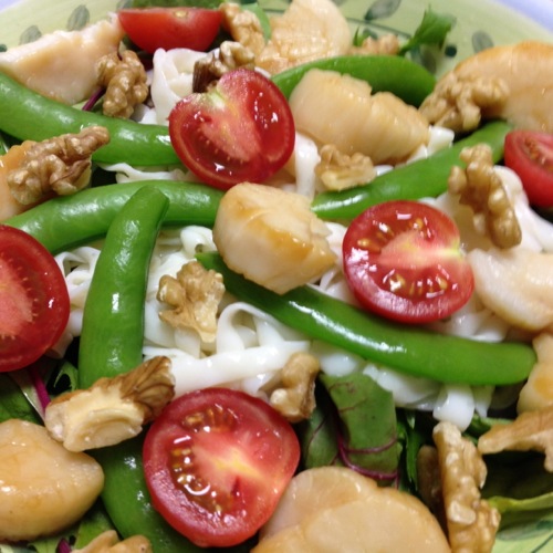 豆乳コンニャク麺・ベビーリーフ・スナップエンドウ・ホタテ・プチトマト・クルミ