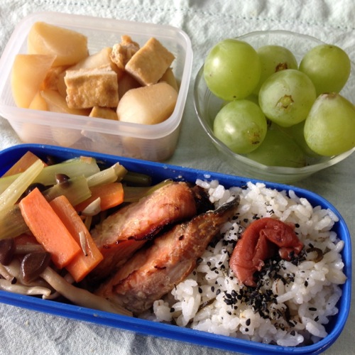 お弁当は 鮭と野菜、ぶどうはFさんにいただいた茨木でも珍しい品種『常陸青龍』です。とっても甘くて美味!ありがとうございます。