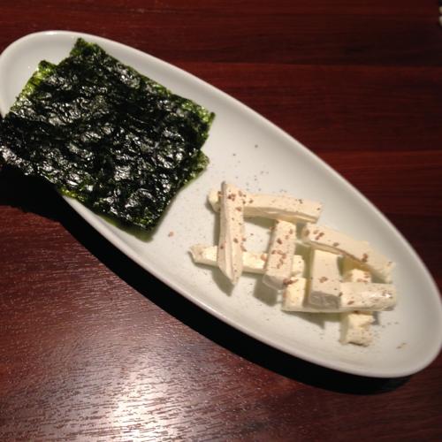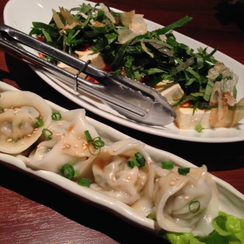 COSARI特製水餃子と薬膳韓国冷奴(えごまの葉が乗っています)