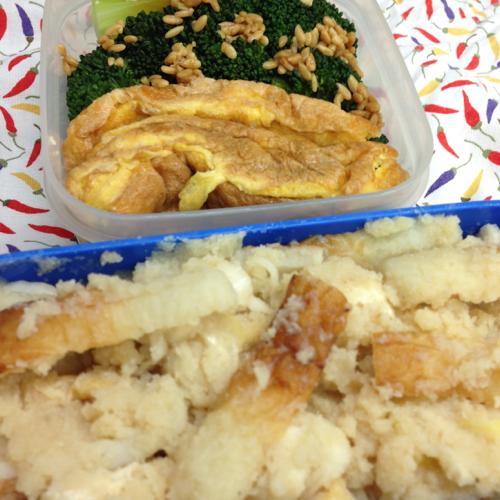 この日の主人の低糖質弁当は、竹輪と長ネギのおから・チーズオムレツ・ブロッコリー(自家製豆乳マヨネーズ)でした。