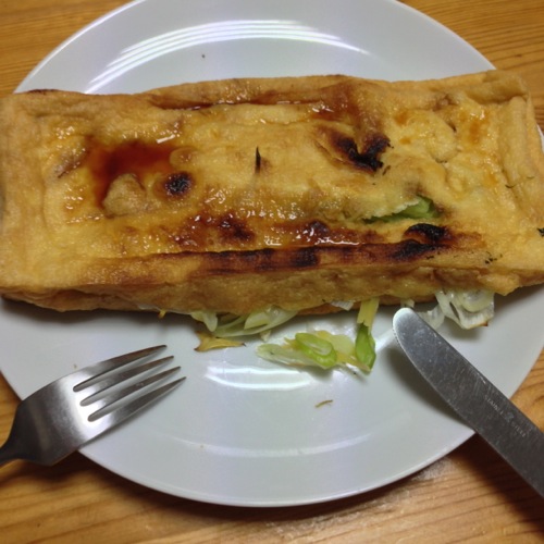 こめ油で揚げた薄揚げに長ネギと生姜を詰めて焼きました。