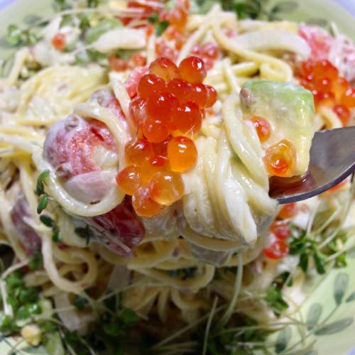 イクラ、スモークサーモン、アボカドのグルテンフリーパスタ
