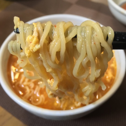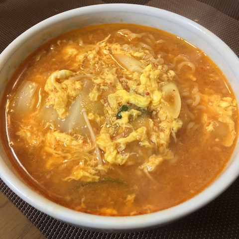 ピリ辛の”豚骨スープ”が残ったので、ノンオイルのインスタント麺をで〆にしました。