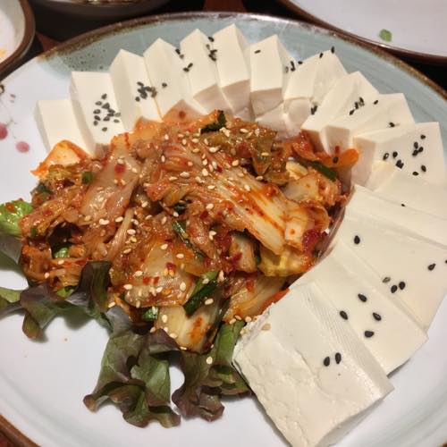 炒めた酸っぱめのキムチと暖かい濃いめの韓国豆腐