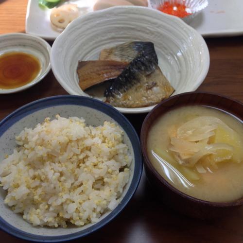 キビご飯とジャガイモ、玉ねぎの味噌汁