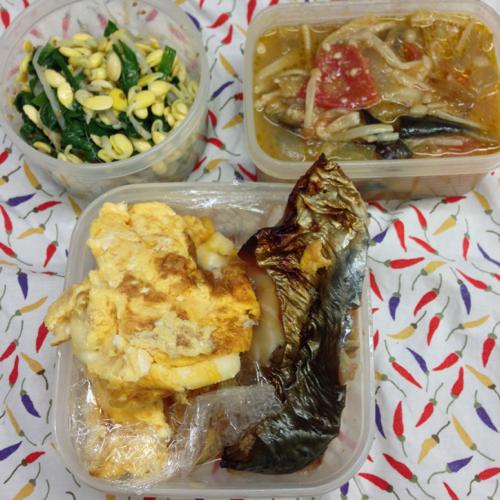 玉子焼き・鰆の塩焼き・もやしとニラのナムル・トマトとシメジの煮物