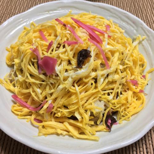 椎茸・人参・ひじき・薄揚げ・生姜・錦糸卵・醤油・みりん