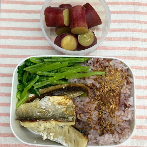 お昼はスティックサバと野菜のお弁当でした。