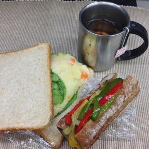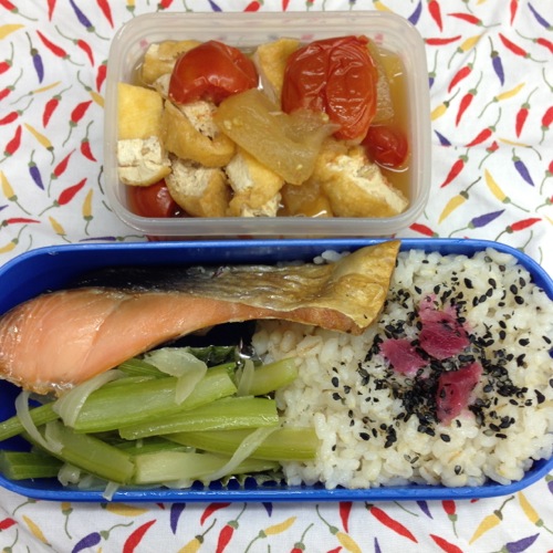 お昼は 鮭、セロリ炒め、ミニトマトと薄揚げの煮物のお弁当でした。