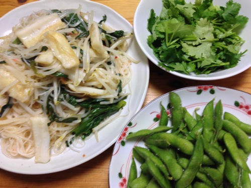 涼しいとやはり過ごしやすく、食欲の秋です。夏は終わったはずですが、今日も美味しそうな枝豆があったので購入。これが最後の枝豆と何度言ったことでしょうか?でも好きなのでついつい。今日のもとても美味しかったです。焼きビーフンと一緒にいただきました。