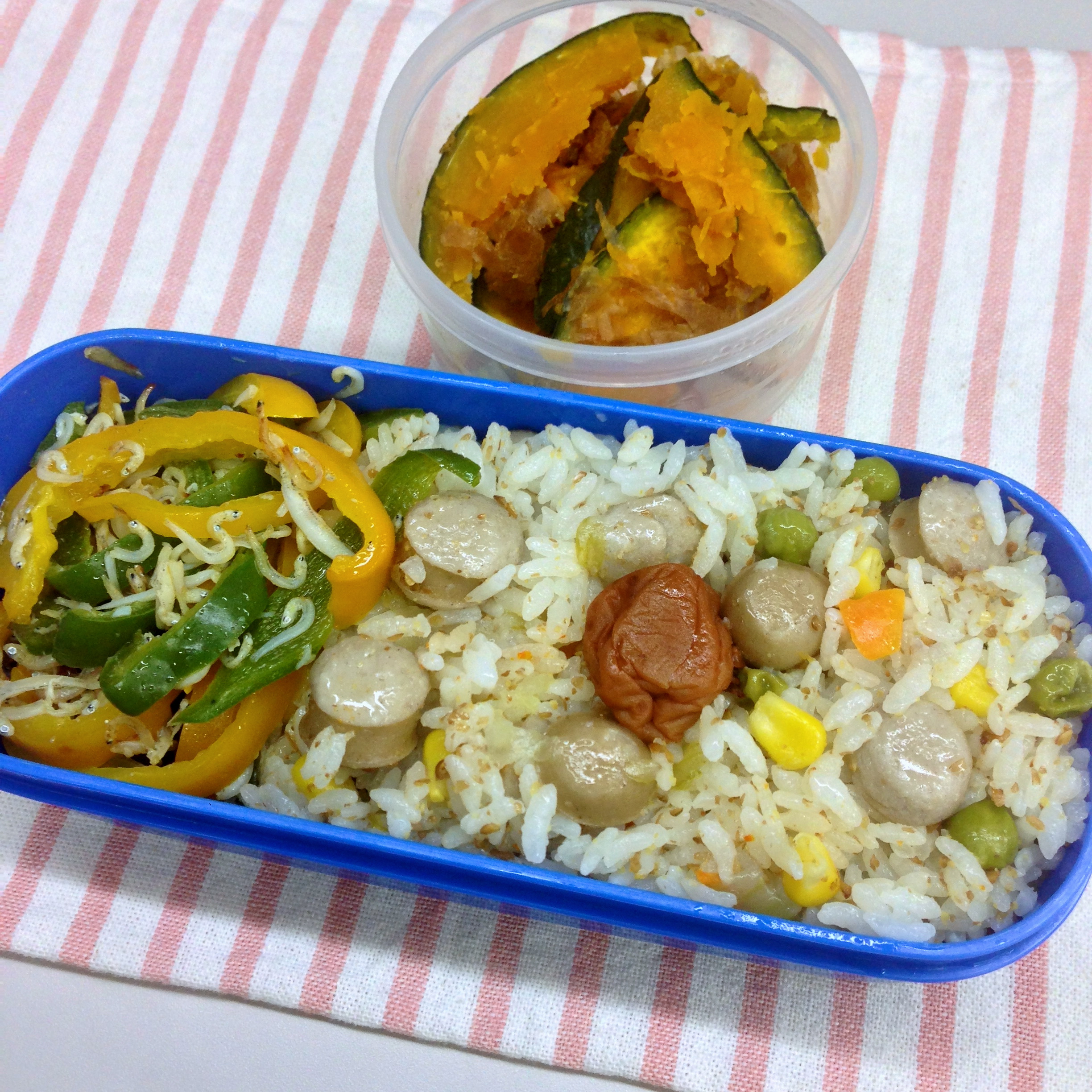 お昼はかぼちゃとミニウィンナーご飯のお弁当でした。