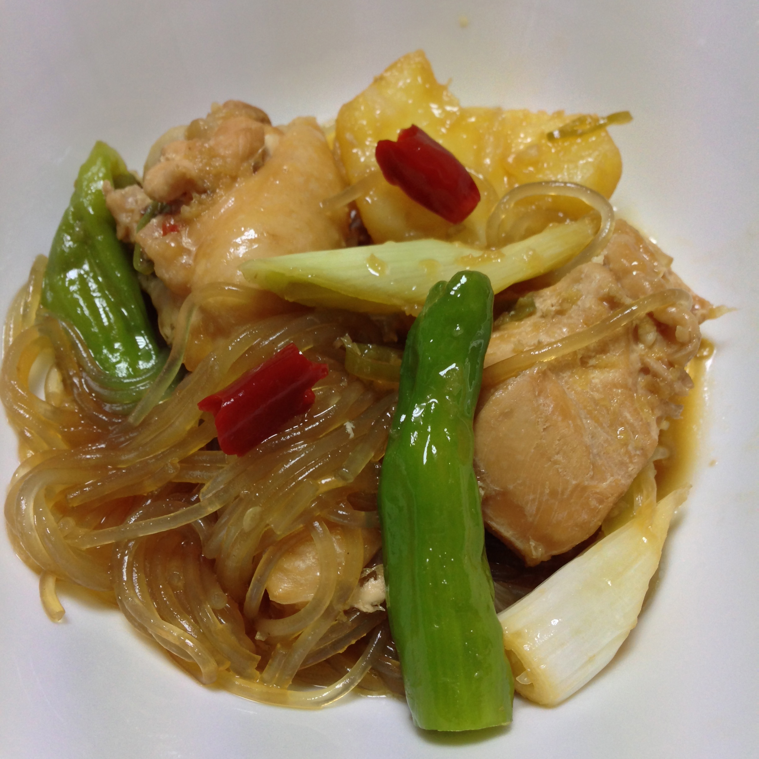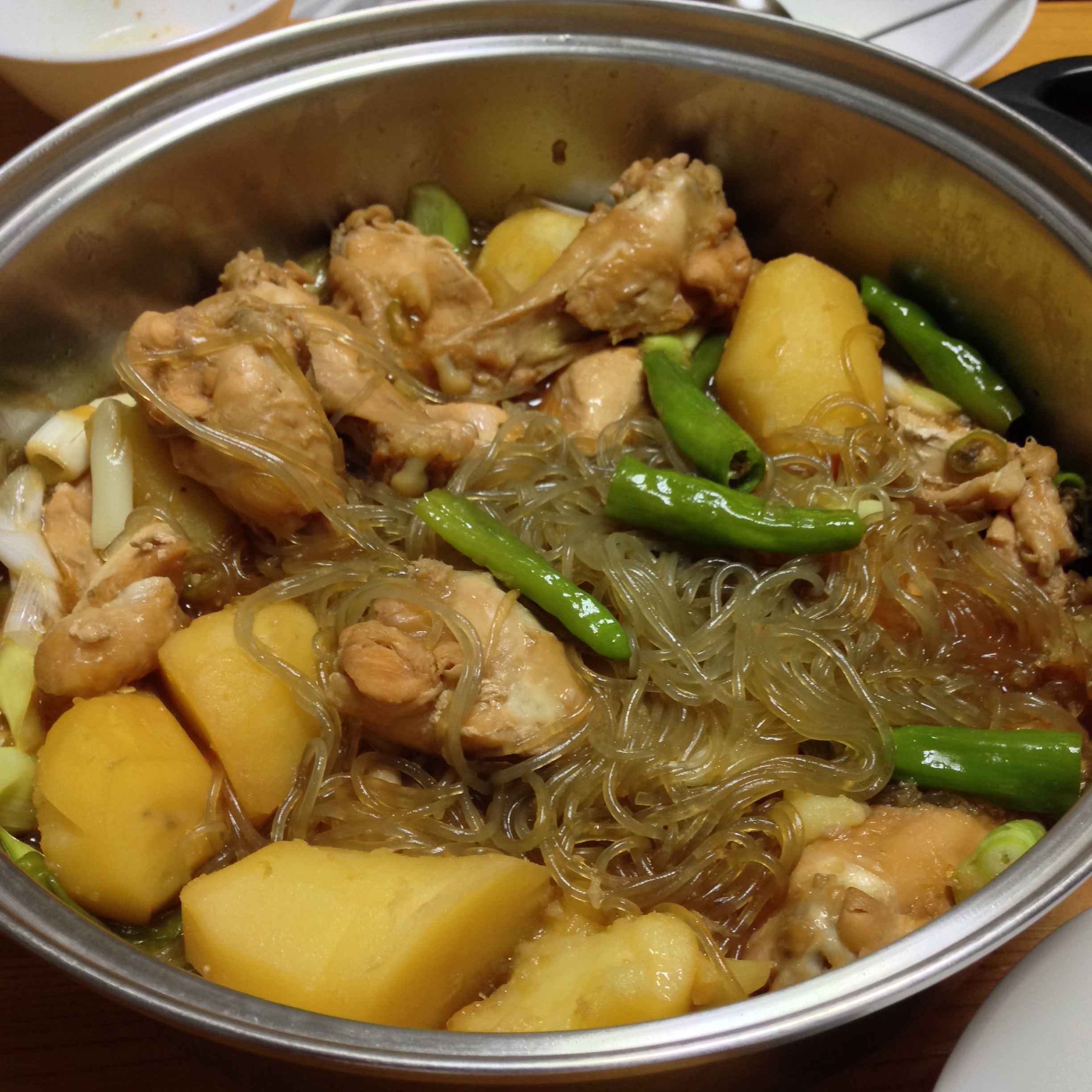 チムタクとは:ぶつ切りの鶏肉、ジャガイモ、タンミョン(韓国春雨)などを大量の唐辛子と一緒に、醤油と砂糖ベースのタレで煮込んだ料理。