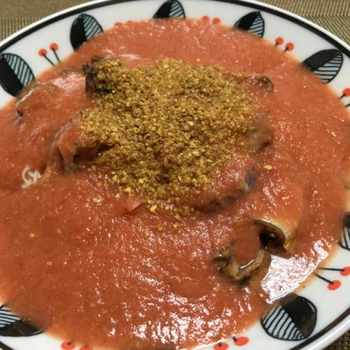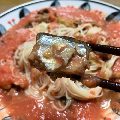 秋刀魚の醤油煮缶で冷たいトマトソーメン