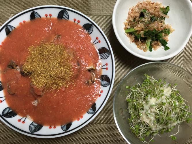 秋刀魚の醤油煮缶・トマト(すりおろし)・玉ねぎ・ローストアマニ粉