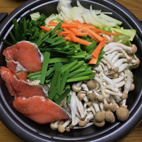 鮭・人参・キャベツ・ニラ・玉ねぎ・シメジ
