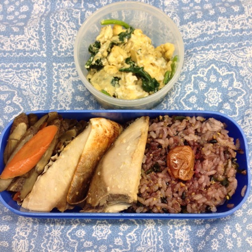 お昼はワラサとニラ玉、根菜のお弁当でした。