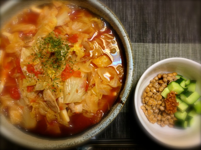 風邪を引いた娘のために腸内環境を整える発酵3種と見た目はイタリアン、味は和風のヘルシーなこんにゃくのスープ麺です。