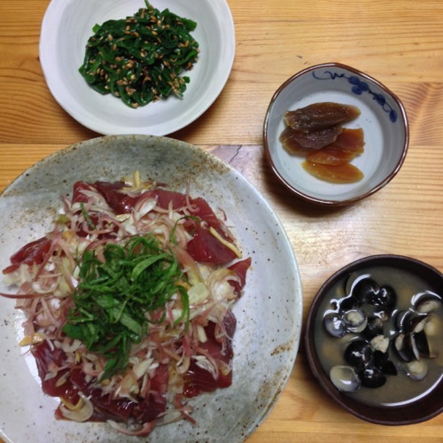 さて、今夜は鰹の手こね寿司としじみ汁です。