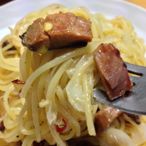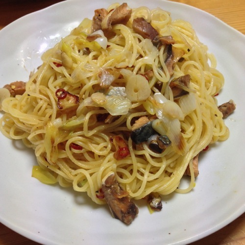 へしこ(鯖の糠漬け)・長ネギ・唐辛子・塩・胡椒・スパゲッティーニ・EXVオリーブオイル